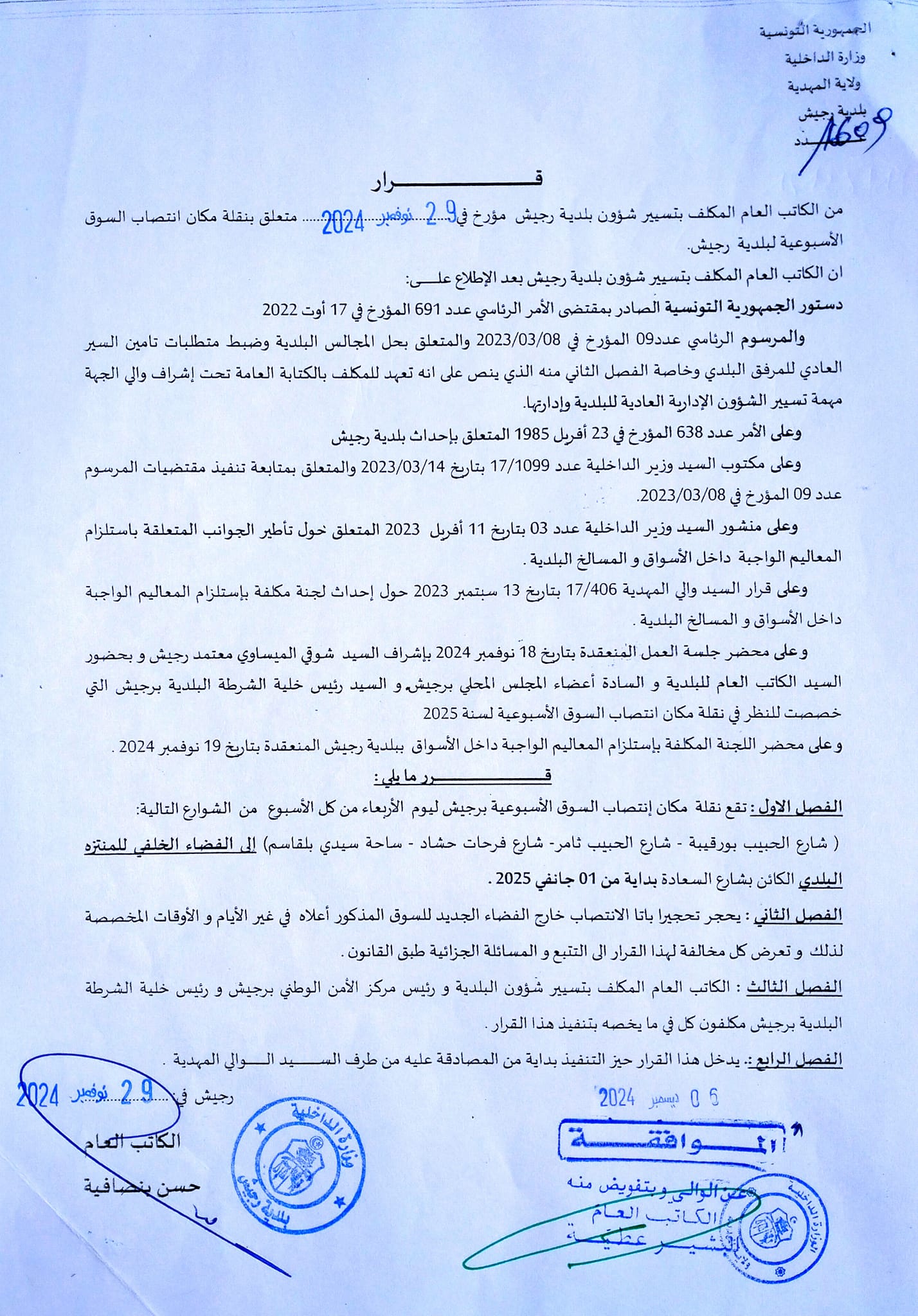 و المتعلق بنقلة مكان انتصاب السوق الأسبوعية برجيش إلى الفضاء الخلفي للمنتزه البلدي الكائن بشارع السعادة و ذلك بداية من 01 جانفي 2025 .